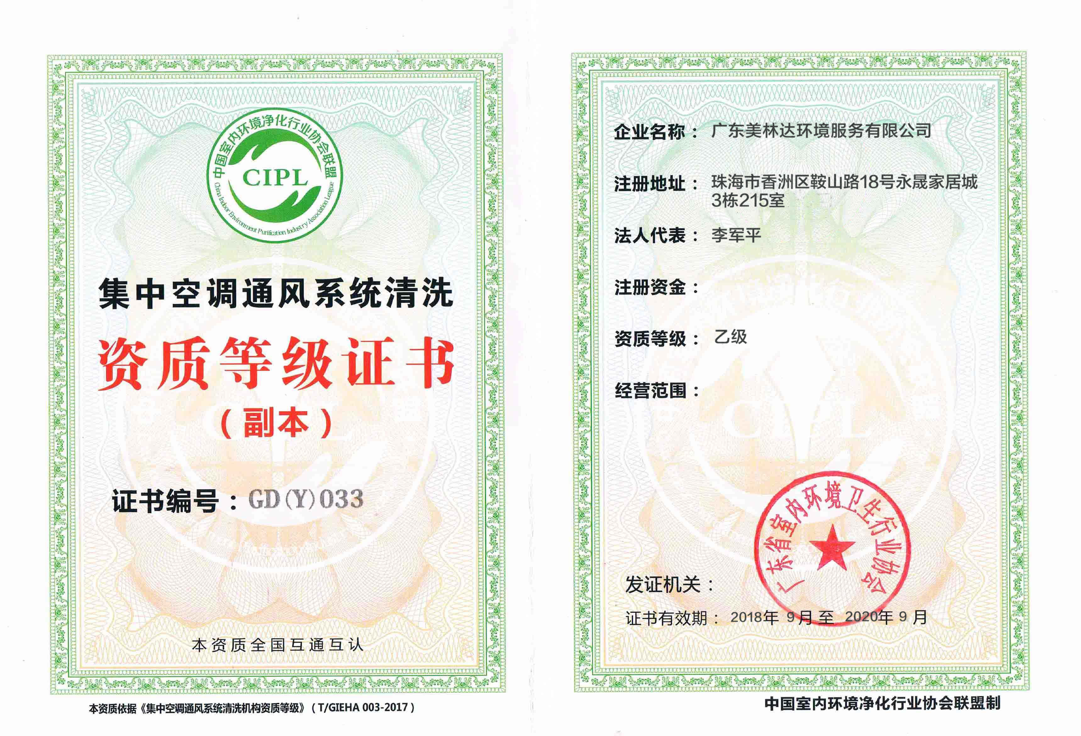 通風空調系統清洗資質證書